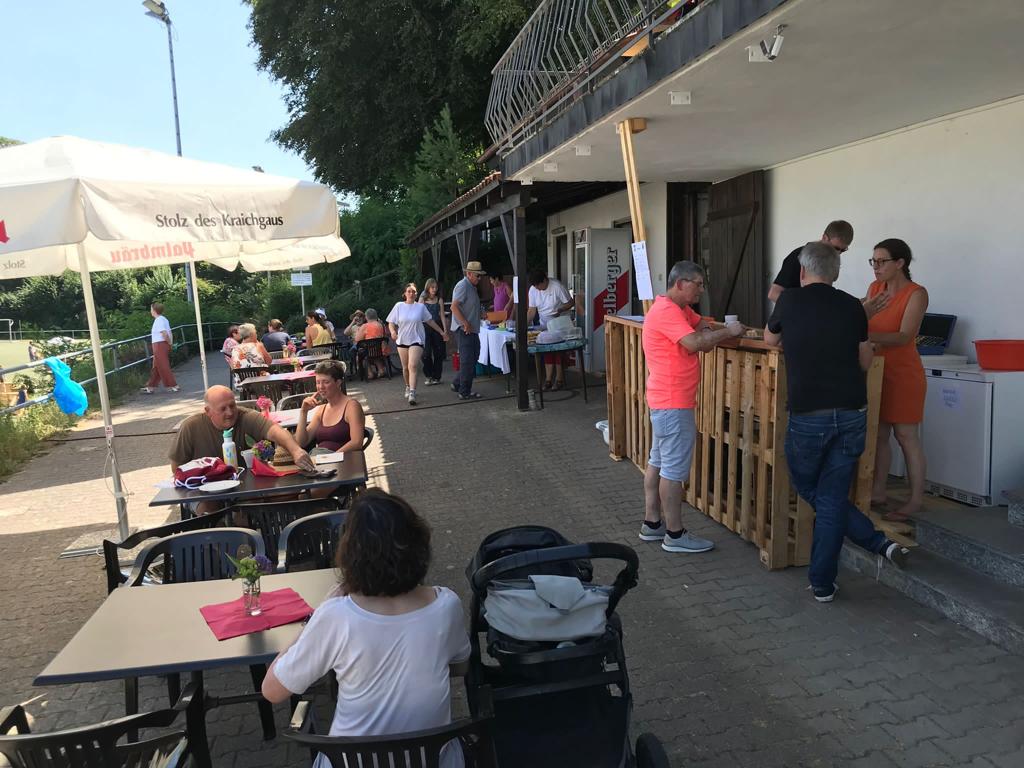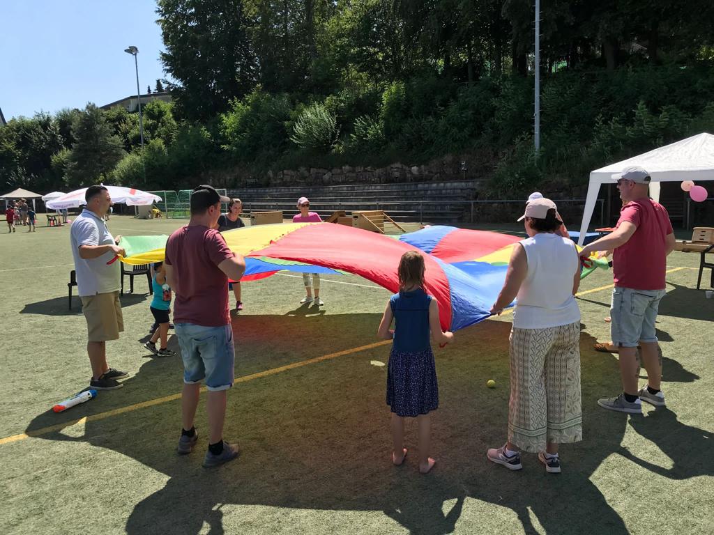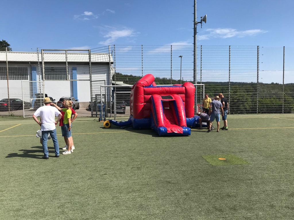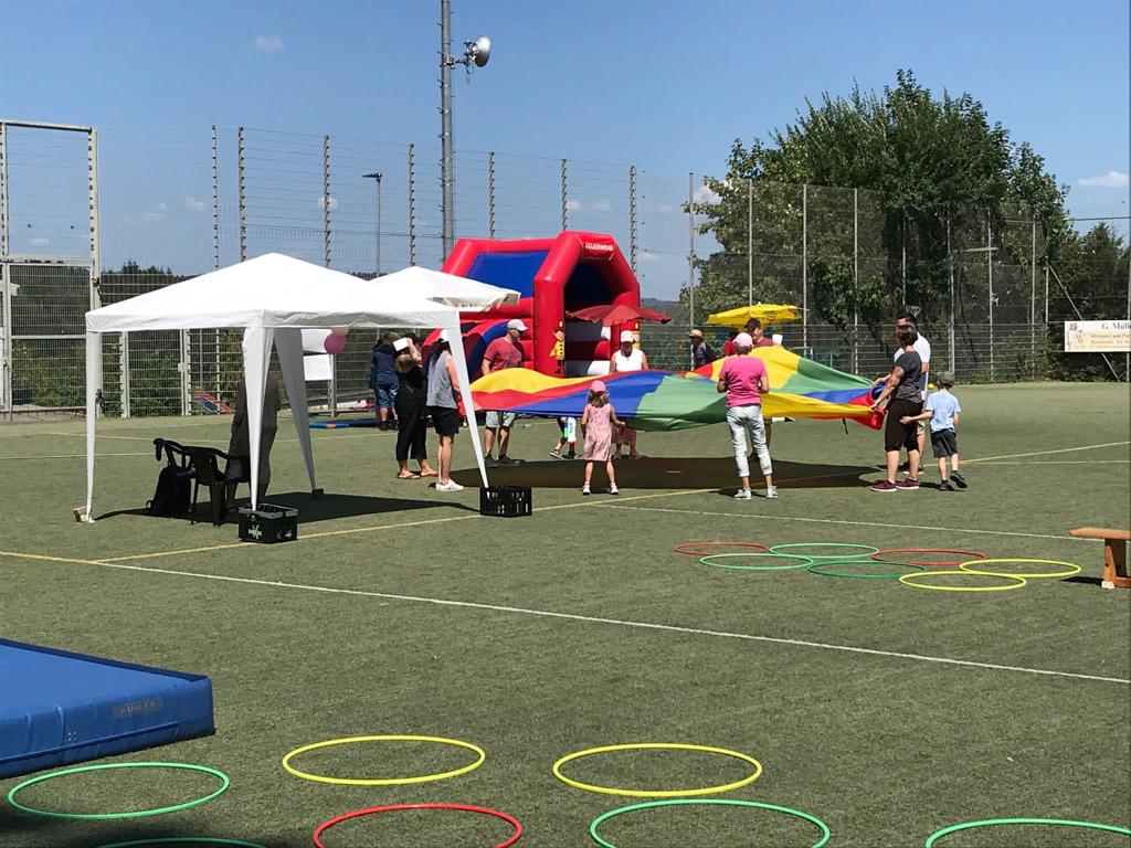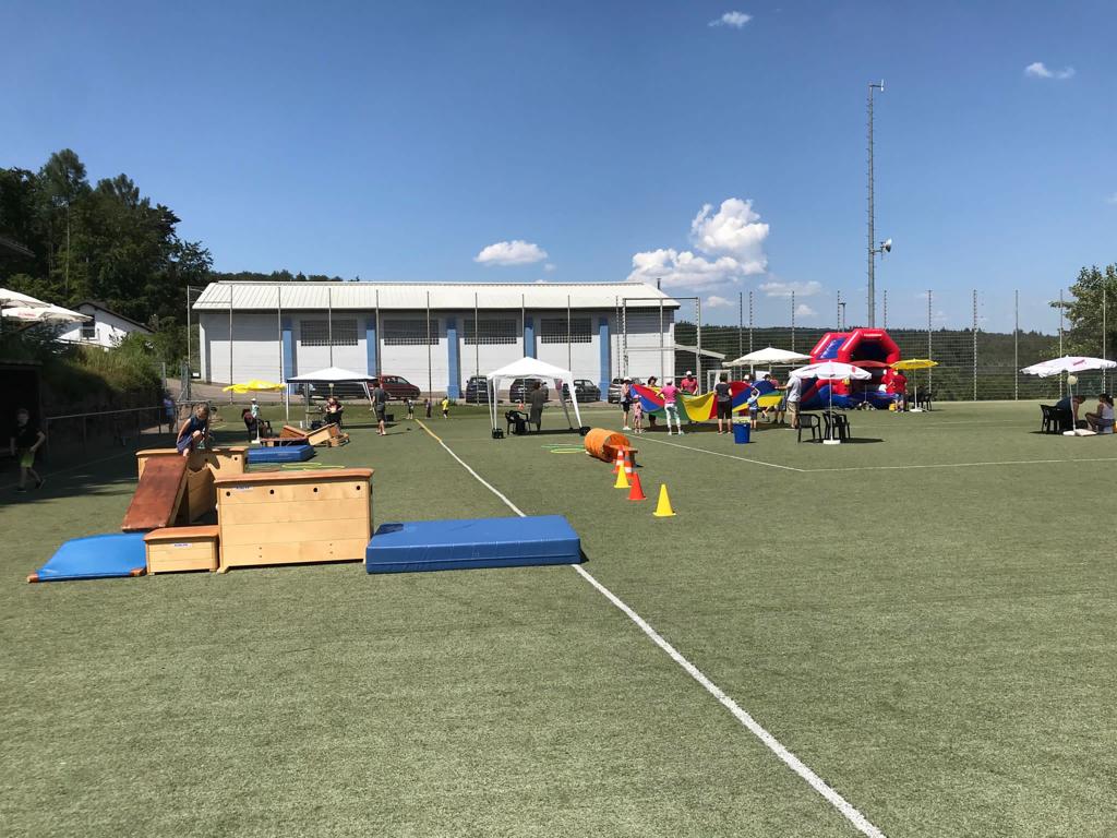 Alle Helferinnen und Helfer standen an ihren Plätzen. Es wurde ordentlich Kaffee und Kuchen verkauft, jede Menge alkoholfreie Getränke geleert und unsere Hotdogs fanden auch guten Zuspruch. Die Stationen mit einem Parcours, an dem man sein turnerisches Talent unter Beweis stellen konnte, und die vielen Einzelstationen wurden durchlaufen. Es gab eine Torwand, Gummistiefelweitwurf, Wassereimer mit Schwämmen füllen, Schwungtuch mit Bällen, Dosenwerfen, Bobbycar-Rennen. Die Kinder bekamen an jeder Station einen Stempel, und wenn die Laufkarte acht Stempel hatte, bekam jedes Kind eine Urkunde und etwas Süßes dazu als Belohnung. Es wurde noch eine Hüpfburg organisiert und zum Ausklang kam Nico mit seinem Eiswagen vorbei. Alle Kinder hatten mächtigen Spaß und es war wirklich für jeden etwas Passendes dabei, egal ob sportlich oder einfach nur just for fun.