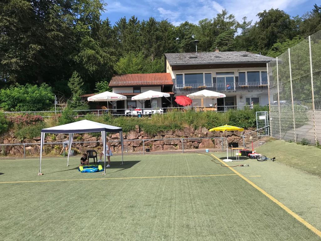 So traf man sich samstagmorgens bei 34 Grad auf dem Sportplatz, um alles aufzubauen und vorzubereiten. Die Geräte mussten von der TSV-Halle rüber auf den Sportplatz transportiert werden. Ein fleißiges „Gewusel“ machte sich auf dem Sportplatz breit. Nach 2 Stunden getaner Arbeit ging man kurz zum Duschen heim und ab 14 Uhr traf man sich wieder und das große Spektakel konnte beginnen.