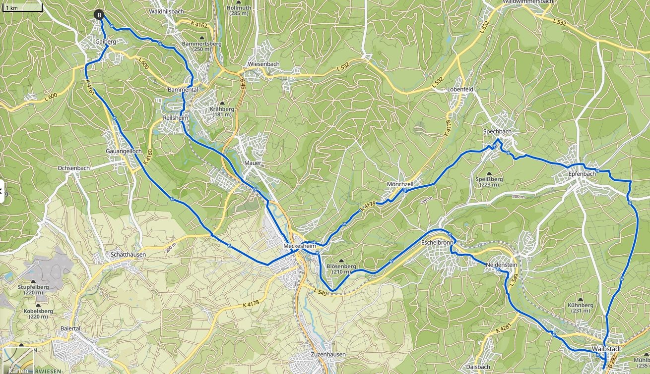 Die Tourenlänge beträgt 45 km und führt uns über Meckesheim, Mönchzell, Spechbach, Epfenbach nach Waibstadt, wo wir eine gemütliche Kaffeepause einlegen und dann über Neidenstein, Eschelbronn, Meckesheim, Gauangeloch zurück nach Gaiberg radeln werden.